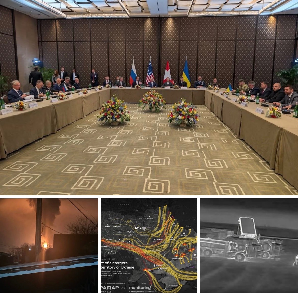 Foto: Jednání v Ženevě. | Ruská rafinérie. | Mapa nočního náletu. | Ruská PVO okem dronu.
