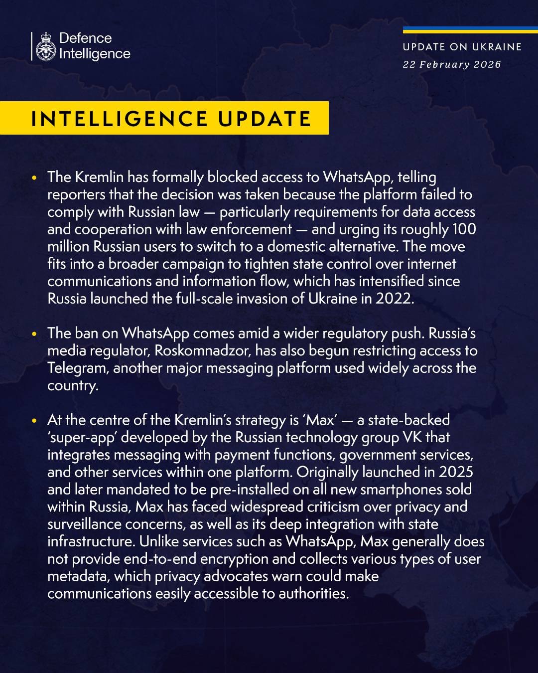 Kreml oficiálně zablokoval přístup k aplikaci WhatsApp a novinářům sdělil, že toto rozhodnutí bylo přijato proto, že platforma nesplňovala ruské právní předpisy. Zejména požadavky na přístup k datům a spolupráci s orgány činnými v trestním řízení. Kreml vyzval přibližně 100 milionů ruských uživatelů, aby přešli na domácí alternativu. Tento krok zapadá do širší kampaně za zpřísnění státní kontroly nad internetovou komunikací a tokem informací, která se zintenzivnila od roku 2022, kdy Rusko zahájilo plnohodnotnou invazi na Ukrajinu. Zákaz WhatsApp přichází v rámci širšího regulačního tlaku. Ruský mediální regulátor Roskomnadzor také začal omezovat přístup k Telegramu, další významné platformě pro zasílání zpráv, která je v zemi široce používána. Jádrem strategie Kremlu je "Max" – státem podporovaná "superaplikace" vyvinutá ruskou technologickou skupinou VK, která integruje zasílání zpráv s platebními funkcemi, vládními službami a dalšími službami do jedné platformy. Max, který byl původně spuštěn v roce 2025 a později byl nařízen jako předinstalovaná aplikace na všech nových smartphonech prodávaných v Rusku, čelí rozsáhlé kritice kvůli obavám o soukromí a sledování, jakož i kvůli své hluboké integraci do státní infrastruktury. Na rozdíl od služeb jako WhatsApp, Max obecně neposkytuje šifrování typu end-to-end a shromažďuje různé typy metadat uživatelů, což podle varování zastánců ochrany soukromí může vést k tomu, že komunikace bude snadno přístupná pro úřady.