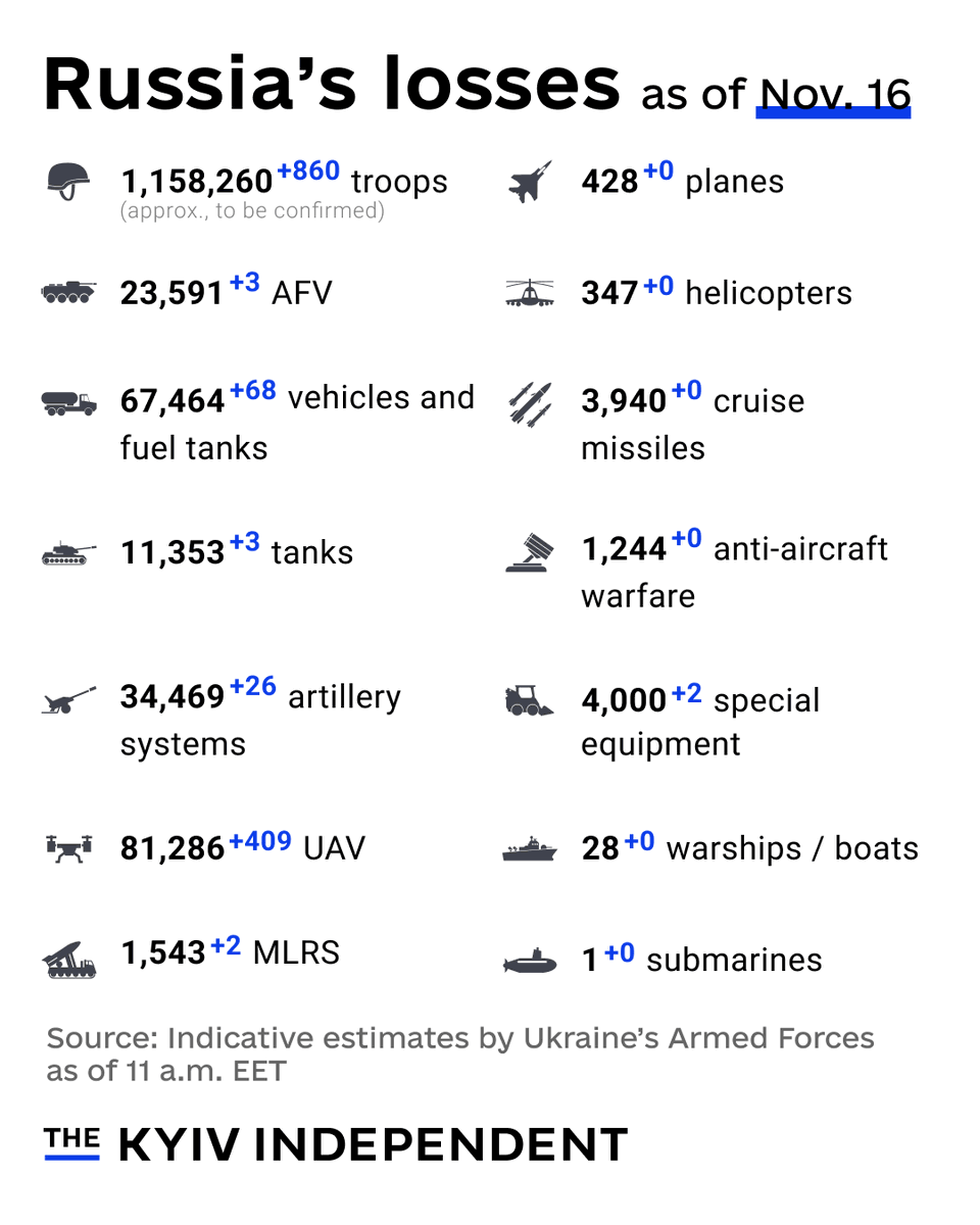 - Rusko 17. listopadu zasáhlo sídlo veřejnoprávní vysílací stanice v Dnipru, ale také například hlavní železniční opravárenskou dílnu, a to přibližně 15 drony Shahed. Zničilo tak televizní studia a dniperskou dopravní infrastrukturu.