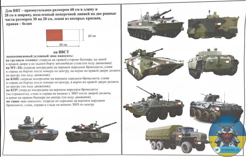 Ruská vojenská technika (co jim ještě zbyla) dostane nové značení. Půjde o obdélník o rozměrech 60 x 20 cm, vertikálně rozpůlený. Levá strana červená a pravá bílá. Vzhledem k tomu, jak dokázali zmastit i obyčejné "Z", tak jsem fakt zvědavý co z nového symbolu vznikne...