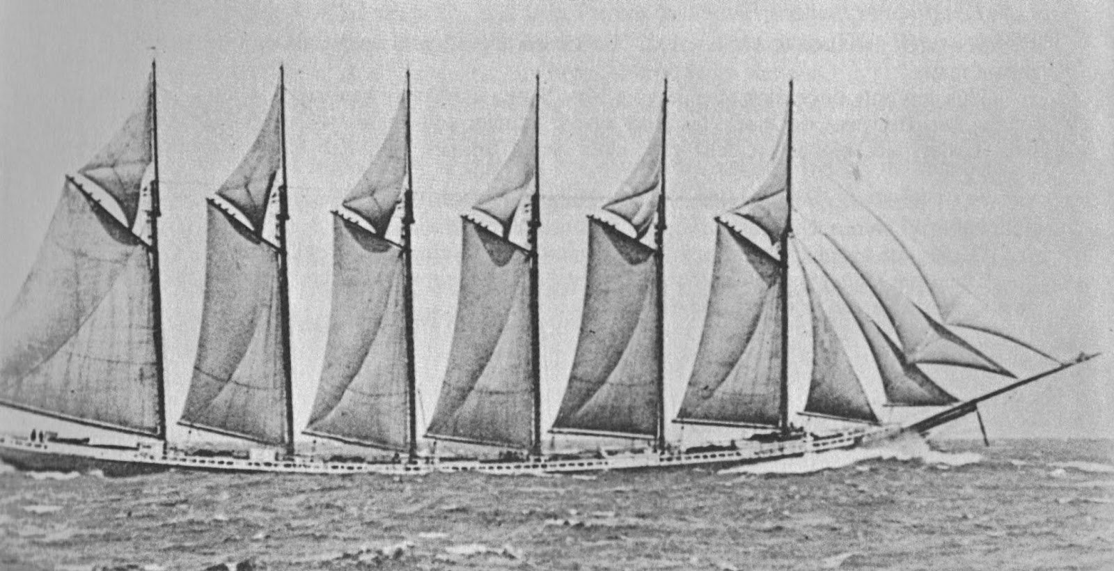 A ani zdaleka nebyl tak elegantní. A pravda, sedm stěžňů bylo maximum možného. Nicméně i ta loď na snímku skončila neslavně. Je to kanadský škuner Edward B. Winslow, postavený léta páně 1908. Oficiálně na něm při cestě z USA do Francie vznikl požár a následně u Pointe du Bec u St. Nazaire ztroskotal. To se ale už psal 10. červenec 1917.