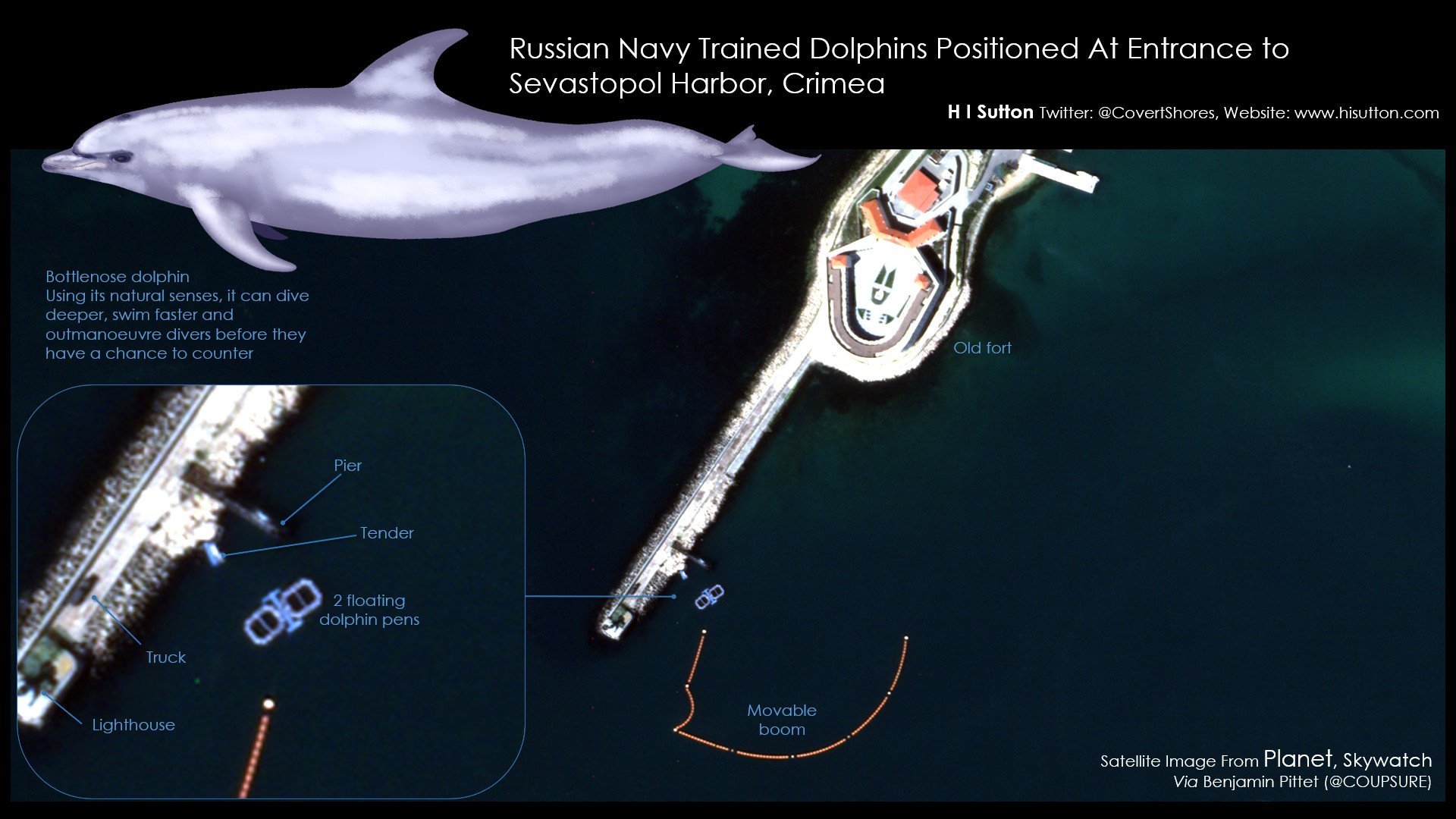 Nejsem si jistý, kolik je v Sevastopolu delfinárií, ale mají zde základnu rovněž delfíni ruského námořnictva - pomáhají chránit kotvící lodě před podmořskými útoky. Koncem dubna 2022 se zmiňovalo, že Rusko nasadilo cvičené vojenské delfíny k ostraze základny v Sevastopolu. Dvojice delfínů se pohybovala u přístupu k přístavu a měla zde zamezit případnému útoku sabotérů. Před několika dny proklouzly do Sevastopolského přístavu námořní drony a lidé v Rusku se hned ptali, kde jsou vojenští delfíni. Tak si říkám, zda zde není spojitost a ona vojenská jednotka nebyla "rozpuštěna", když se ukázalo že proti těmto hrozbám jsou delfíni k ničemu.