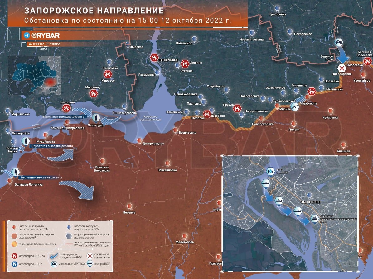 Existuje vysoká pravděpodobnost, že se do oblasti Energodaru vrhnou sabotážní a útočné skupiny námořní pěchoty jak z Nikopole, tak ze Zolotaja Balka. V současné době probíhá vypouštění vodní nádrže Kachovka, což by mohlo způsobit poškození pobřežních bariér.