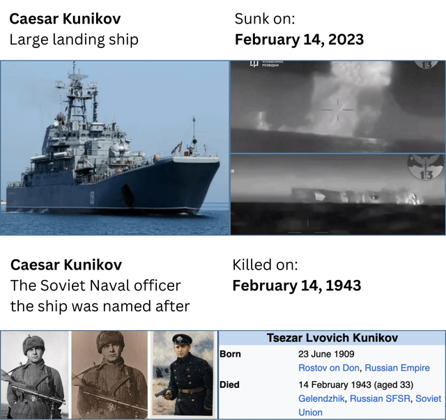 Dnes Ukrajinci u Krymu potopili ruskou výsadkovou loď Caesar Kunikov (BDK-64) třídy Ropucha. Podle ruských zdrojů prý posádka přežila, ale vzhledem k tomu že byla plná munice a tlaková vlna rozbíjela na břehu okna, tak to bude značně nepravděpodobné.