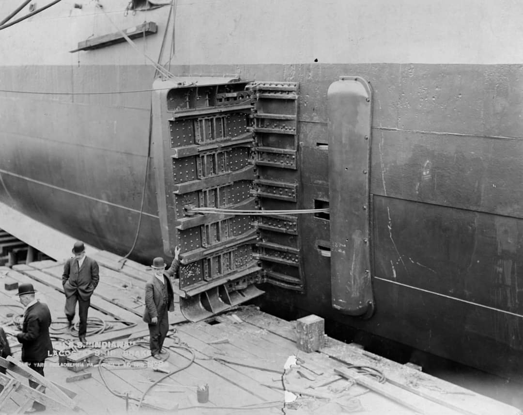 Experimentální Lacosteho brzdný systém na bitevní lodi USS Indiana (BB-1), duben 1910. Tato účinná brzda se vyklápěla jako křídla uprostřed trupu lodi. Námořnictvo ale naznalo, že tyto brzdy loď příliš zpomalují (ve sklopeném stavu), byla náročná na údržbu a dále nebyla montována. Zdroj David Zao Zaorálek skupina Technické i jiné zajímavosti.
