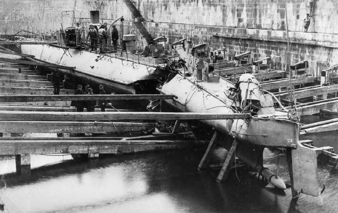 Francouzská torpédovka Edmont Fontaine potopená v květnu 1891 při námořním cvičení poblíž Cherbourgu křižníkem Surcouf. O tom jakým způsobem byla potopena názorně vypovídá stav trupu umístěmu po vyzvednutí v suchém doku: