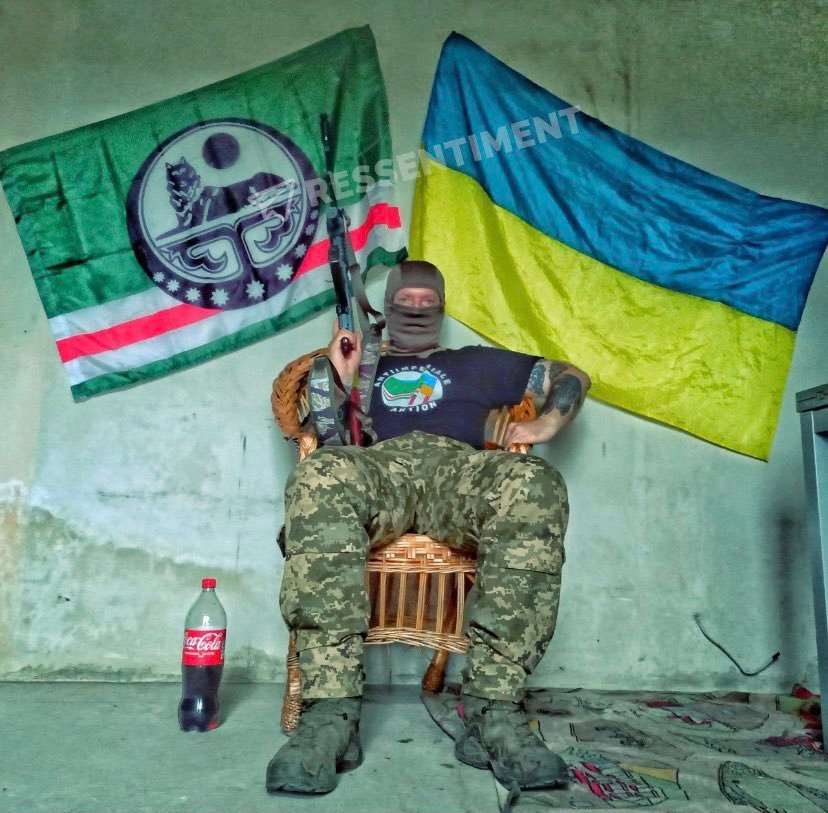 Čečenský pro-ukrajinský bojovník sedící před vlajkou Ukrajiny a Ičkerie - svobodného Čečenského státu z let 1991–1994 a 1996–1999.