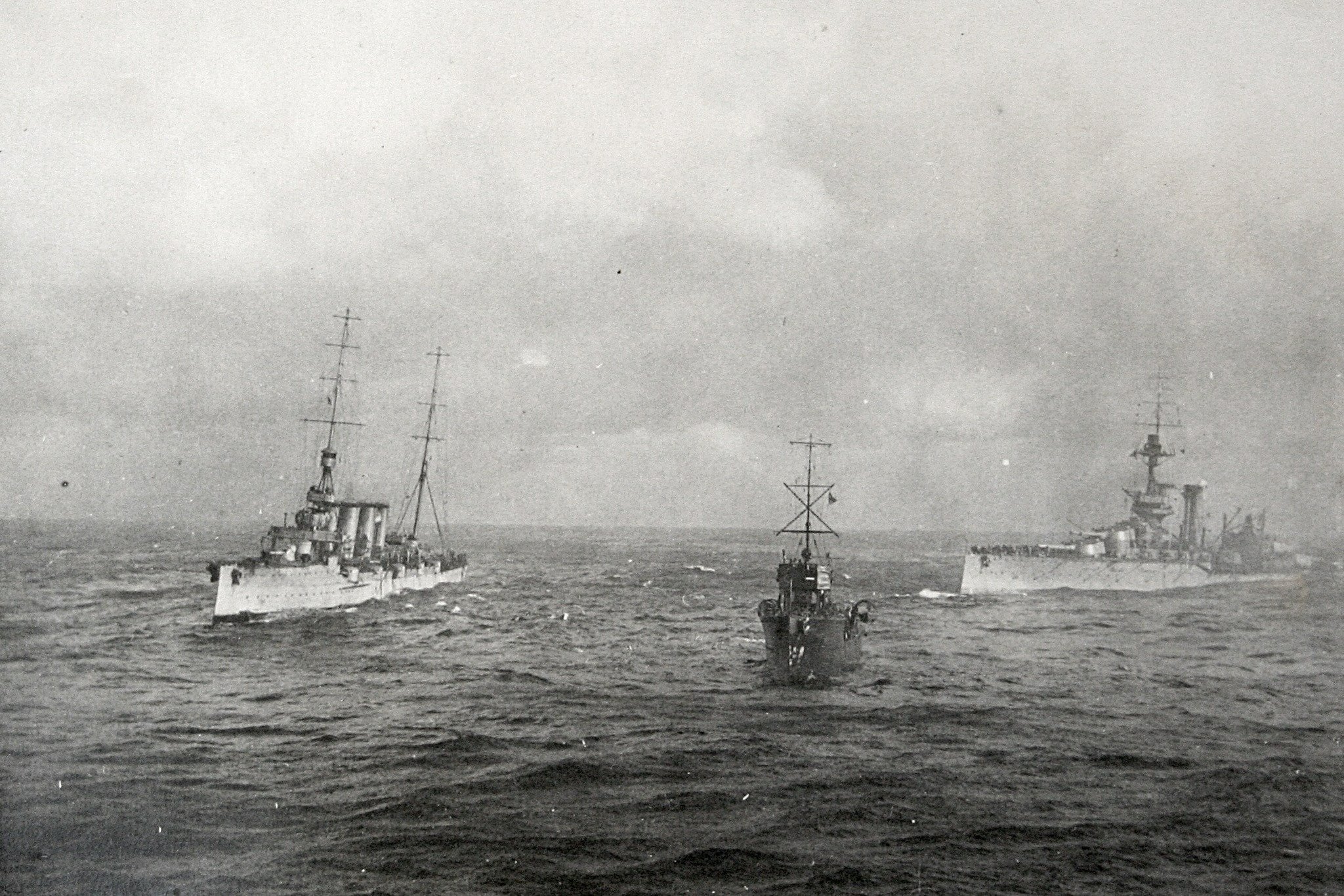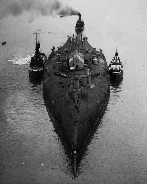 Pak je to lehké - je to potápějící se bitevní loď HMS Audacious po najetí na německou minu v říjnu 1914. Zaoceánský parník RMS Olympic se podílel na pokusech o její záchranu a nakonec převzal na palubu její posádku.