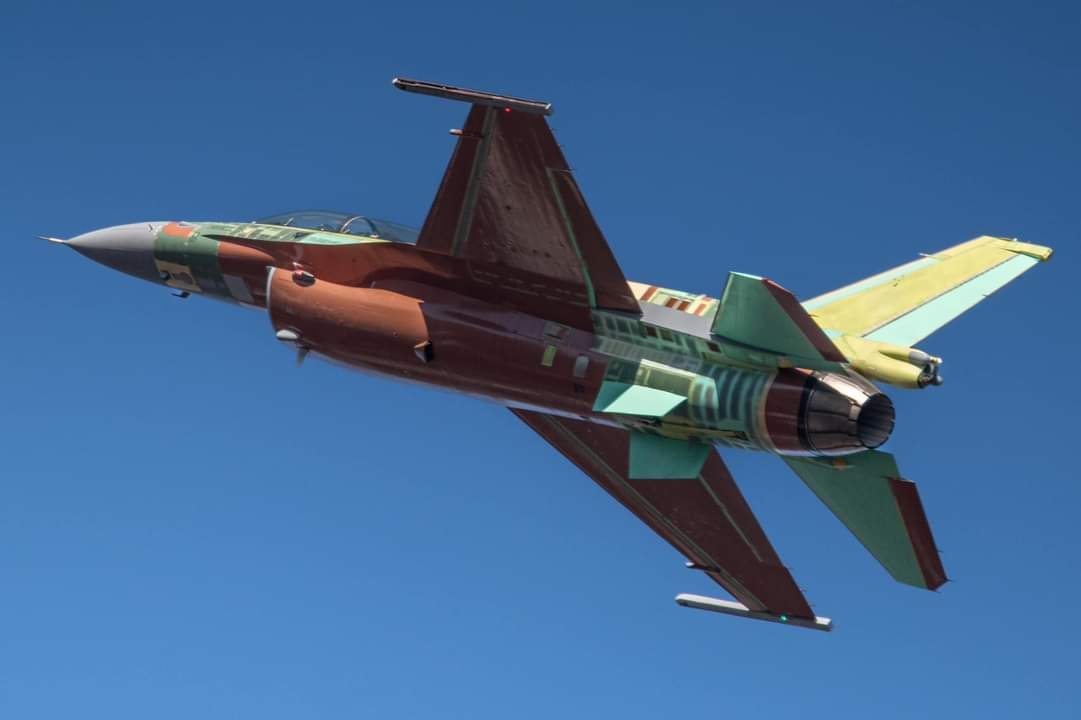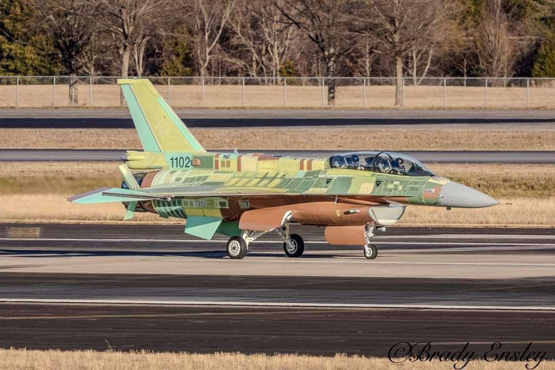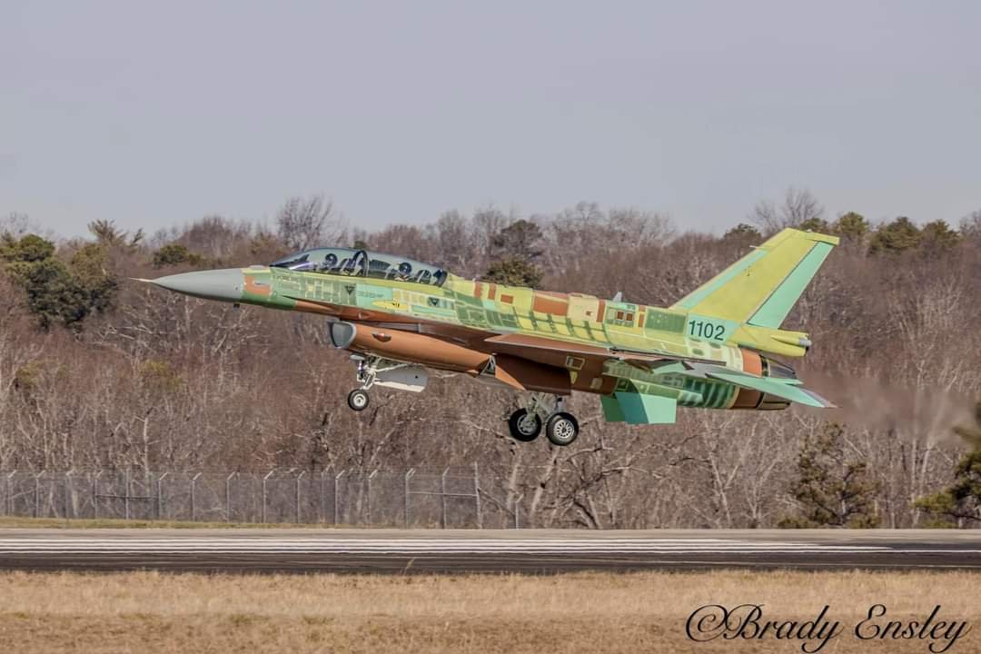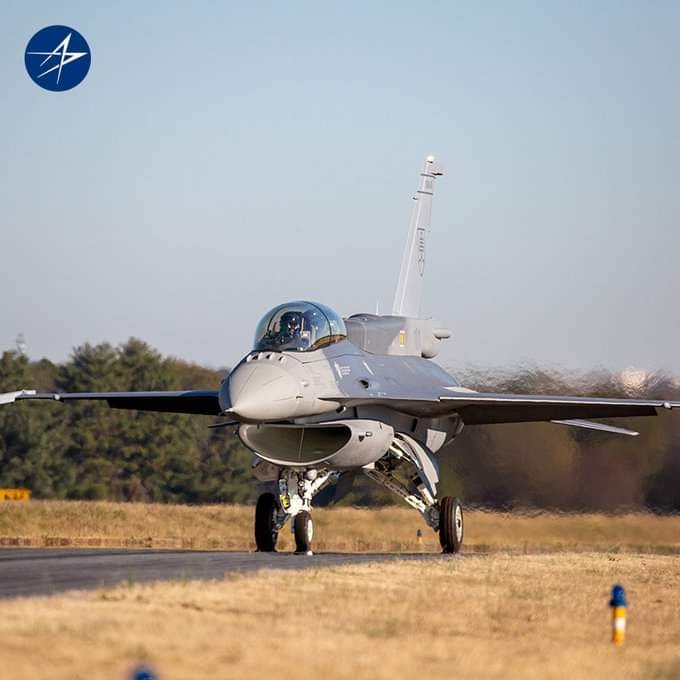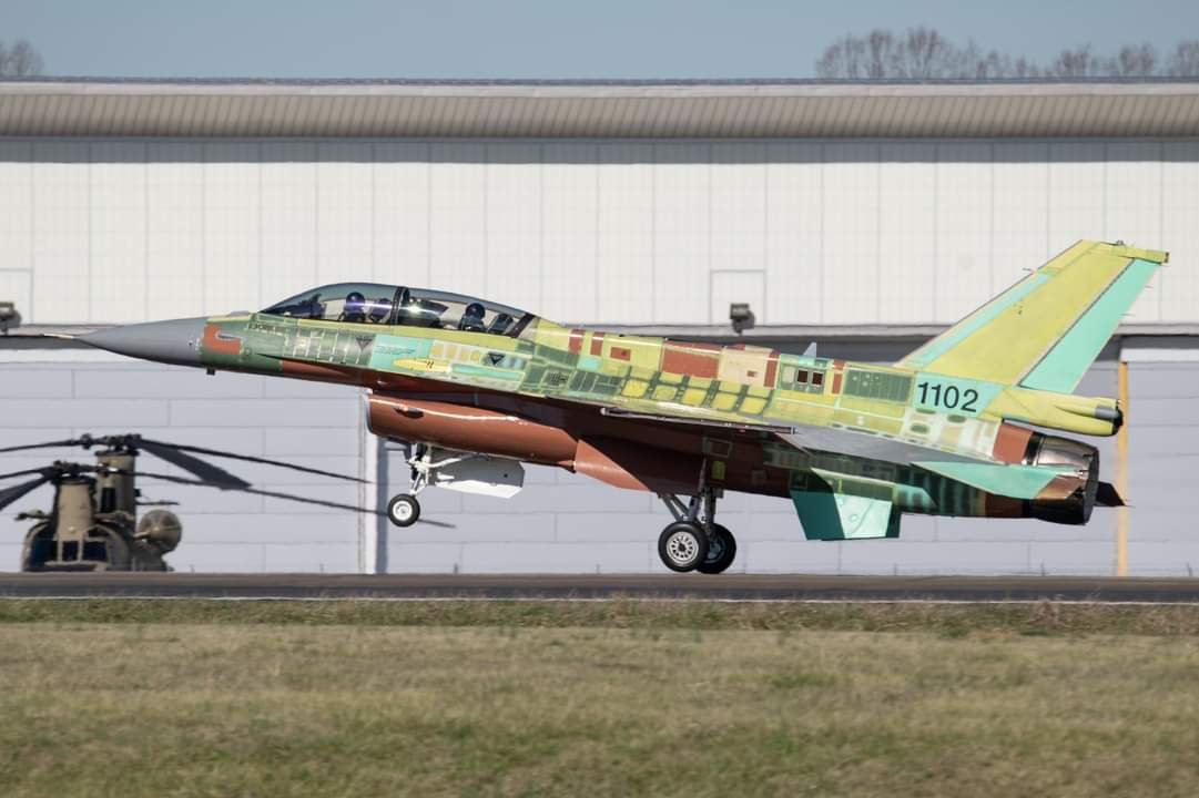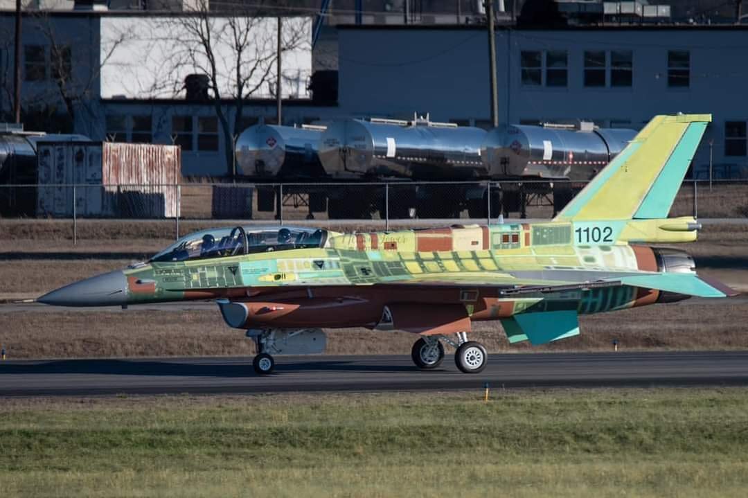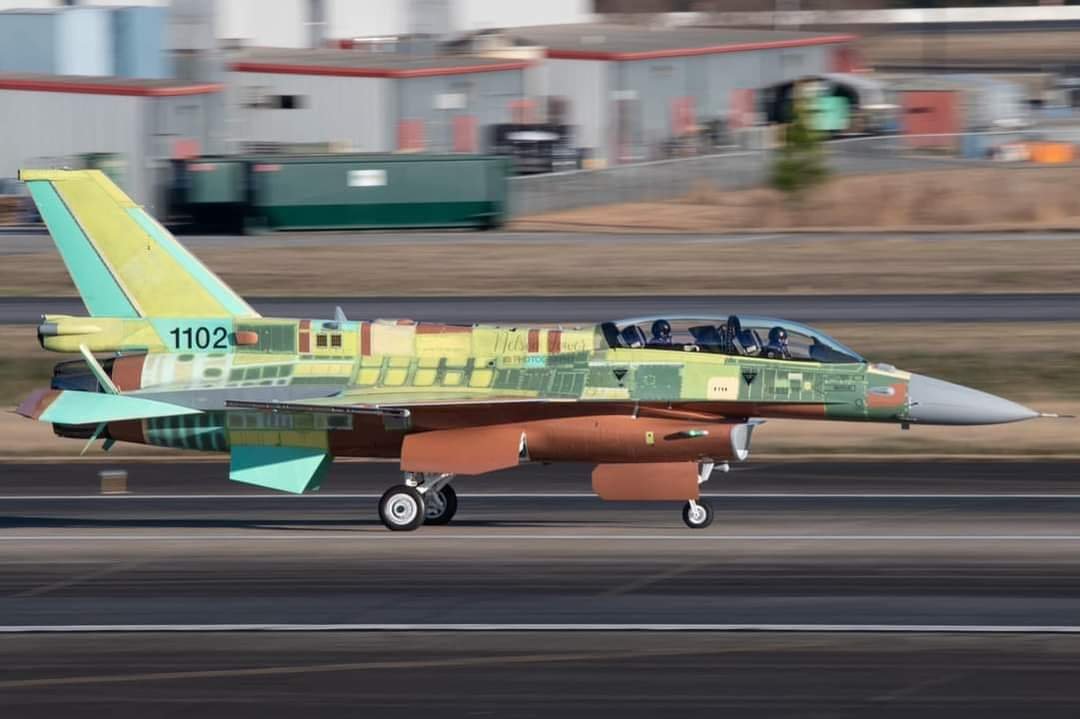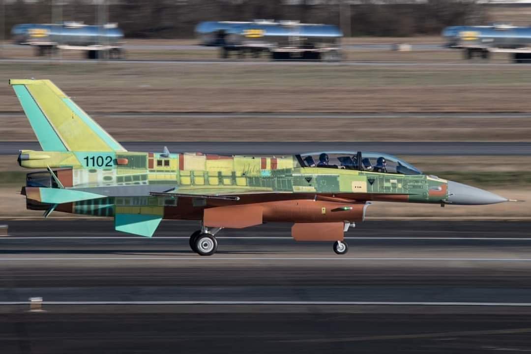 Prvý let ďalšej F-16D Block 70 zo 14.2.2024 ešte bez náteru (foto Nelson Tower & Brady Ensley):