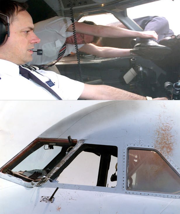 Během letu z Birminghamu do španělské Malagy vypadlo z rámu dříve opravované čelní sklo. Ve výšce několika tisíc metrů se do kabiny začala valit hustá bílá mlha a vichr o rychlosti přes 600 kilometrů za hodinu. Kapitána Tima Lancastera podtlak vytáhl rozbitým oknem ven z letadla, proudící vzduch jej pak obrovskou silou přitiskl k vnější stěně kabiny. Jeho nohy zůstaly zaklíněny do řídících pák, které tlačil dopředu a deaktivoval tak autopilota, čímž letoun zahájil prudké klesání. Hukot v kabině byl tak silný, že osádka mezi sebou nemohla komunikovat řečí. Kopilotovi Alastairu Atchisonovi se brzy podařilo kapitánovy nohy vyplést z řízení a převzít nad strojem kontrolu, načež kapitán ve výšce asi tři tisíce metrů, s poklesem rychlosti a tlaku, spadl ze střechy pro změnu na bok pilotní kabiny. V této poloze jej drželi stevardi v obavě, že mrtvé tělo by v případě odfouknutí mohlo poškodit křídlo letounu nebo být nasáno do motoru. Osádce se nakonec podařilo nouzově přistát na letišti v Southamptonu, přestože neměli žádné mapy (vylétly z okna) a většina elektronických přístrojů nefungovala. No a aby toho nebylo málo, mrtvola kapitána, která jim na zemi spadla do kabiny jak hadrová panenka, se na letišti probrala. Tim Lancaster poté pokračoval v práci pro British Airways a EasyJet. Všech šest členů osádky i 81 pasažérů tak tuto nehodu zdárně přežilo.