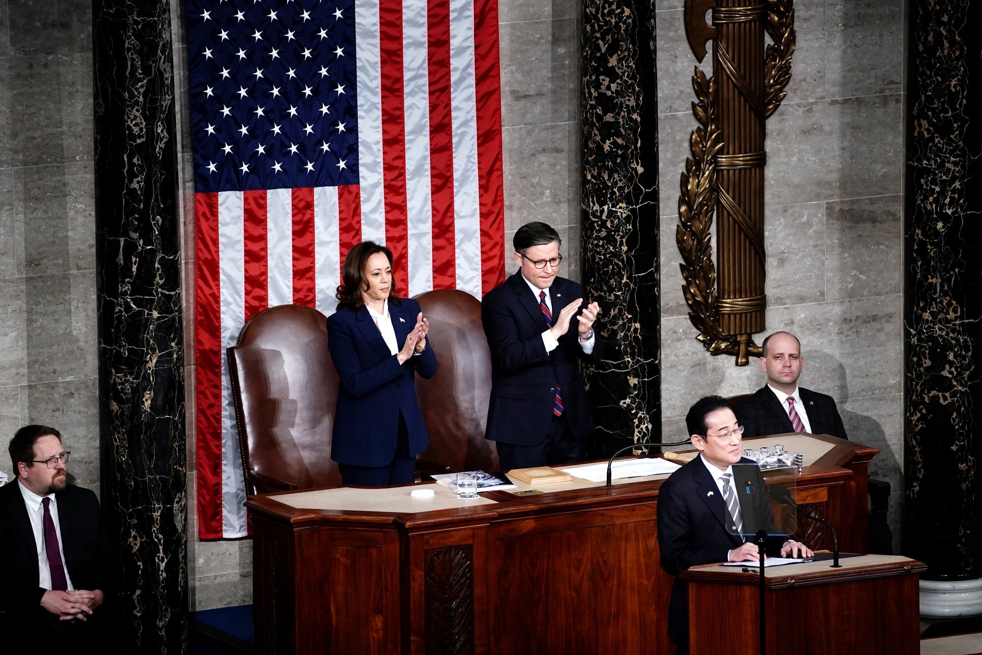 Po jednání s americkým prezidentem Fumio Kishida přednesl projev před americkým Kongresem, ve kterém potvrdil užší zapojení Japonska do obranných struktur Tichomoří včetně zapojení do některých struktur paktu AUKUS. Prohlásil, že Čína představuje bezprecedentní výzvu míru a stability mezinárodní komunity.