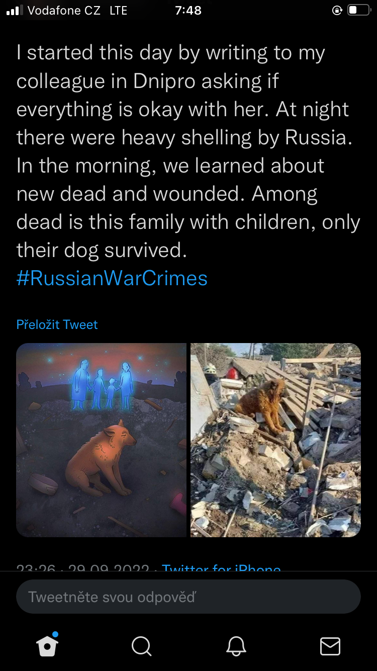 Dnešní den jsem začal tím, že jsem napsal své kolegyni do Dněpru a zeptal se jí, jestli je všechno v pořádku. V noci došlo k silnému ostřelování ze strany Ruska. Ráno jsme se dozvěděli o nových mrtvých a zraněných. Mezi mrtvými je i tato rodina s dětmi, přežil jen jejich pes.