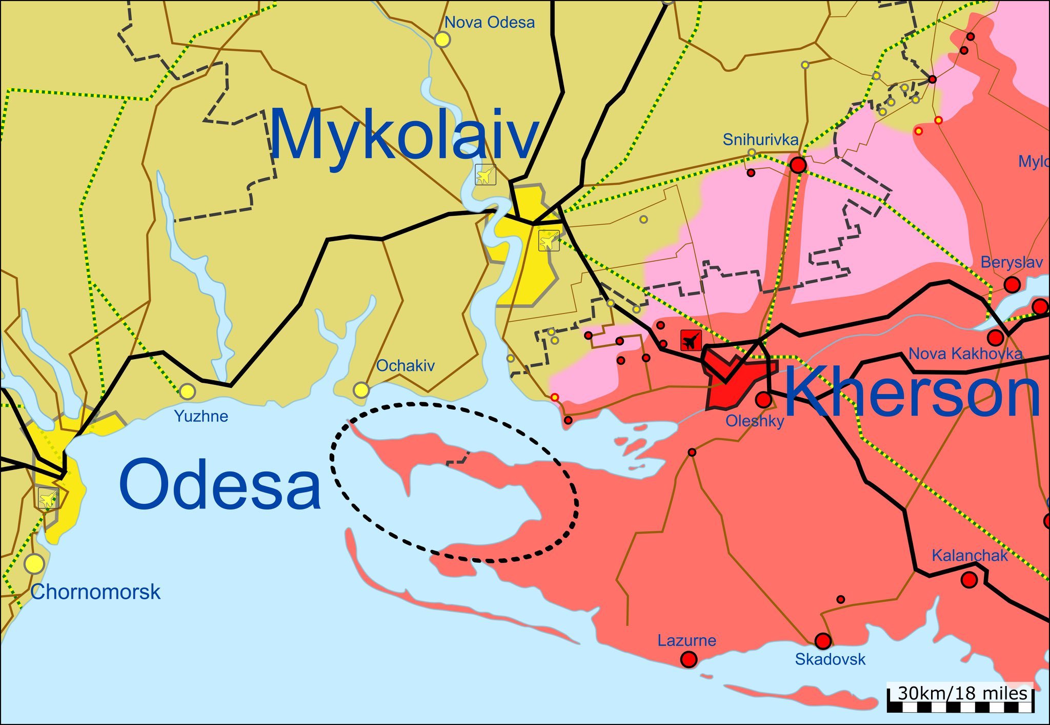 Starosta města Olešky naznačil, že ozbrojené síly Ukrajiny vrátily Olešky pod kontrolu ukrajinských ozbrojených sil. Informace jsou předběžné, ale pokud jsou pravdivé, znamená to, že ozbrojené síly již Dněpr překročily a jsou na levém břehu. Olešky je město v Chersonské oblasti na jižní Ukrajině. Leží na levém břehu jednoho z ramen Dněpru, naproti oblastnímu městu Cherson, jehož satelitem se během 20. století stal. Žije zde přibližně 31 000 obyvatel.
