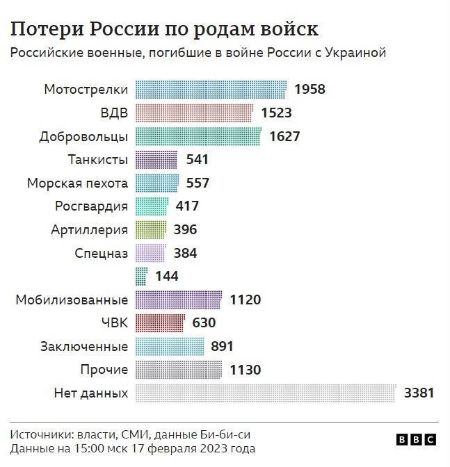 Během pouhých dvou únorových týdnů se však ruskému servisu BBC společně s Mediazonou (v Rusku uznávanou jako "zahraniční agent") a týmem dobrovolníků podařilo potvrdit jména 1679 mrtvých, což je pětkrát více než obvyklé týdenní údaje. Jedná se o největší nárůst ruských vojenských obětí od invaze na Ukrajinu. A to hovoříme pouze o údajích, které se podařilo zjistit a ověřit z otevřených zdrojů, což znamená, že skutečný počet obětí je určitě ještě vyšší.