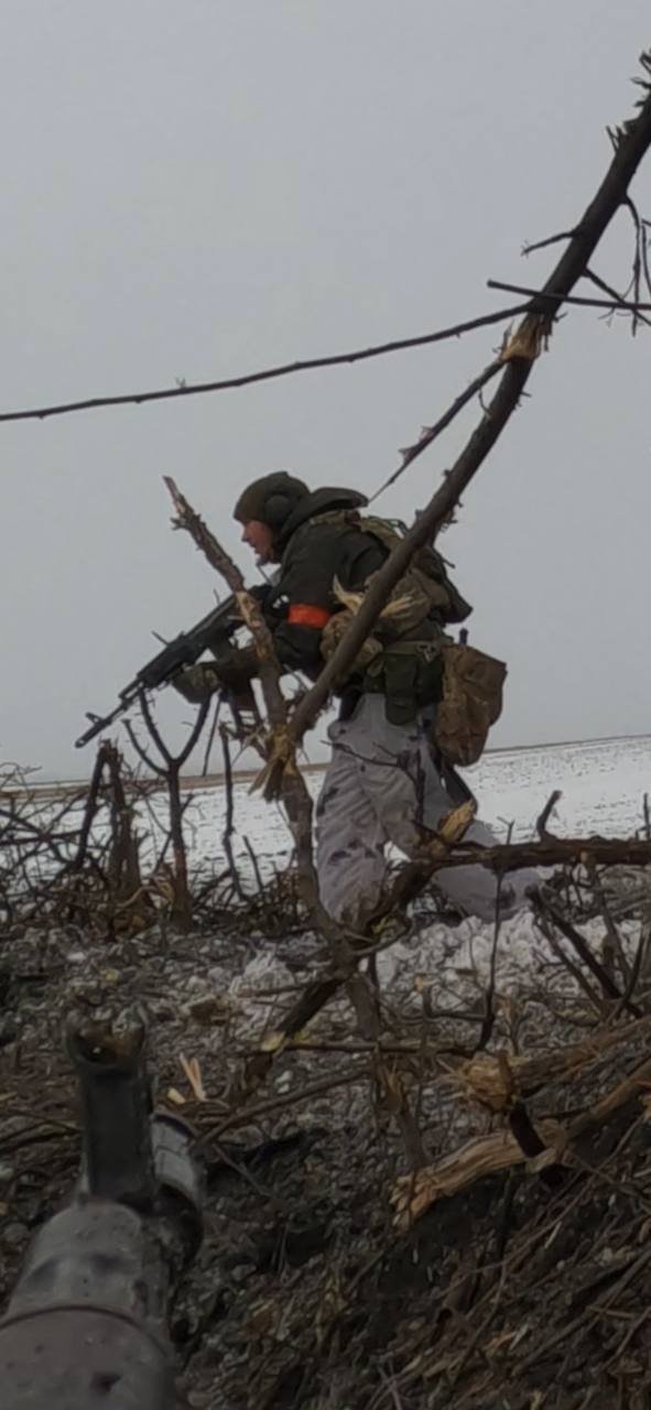 Ruský voják při útoku na ukrajinský zákop, jen sekundu před tím, než byl eliminován. Je to screenshot z videa GoPro kamery na helmě, kde voják ukrajinské 92. samostatné mechanizované brigády odrazí útok ruské útočné skupiny (cca 10 mužů a BTR). Tady je ta část (viz odkaz), kdy pomocí RPG zlikviduje ono BTR a pak tohoto vojáka. Vlevo dole je pěkně vidět i hlaveň zbraně co použil. Jak můžete vidět, v případě nepřítele nejde o nějakého nezkušeného mobíka (dle vzoru lumík), ale velmi dobře vystrojeného a vyzbrojeného profesionála. Má moderní neprůstřelnou vestu (zboku však nefunguje), plně osazený bojový opasek, maskovaný převlečník kalhot, docela moderní pušku - byť bez kolimátoru, a přes zimní čepici střelecká sluchátka. Že jde o profesionála můžeme vidět i na tom, že si nevzal helmu - kvůli lepšímu komfortu.
