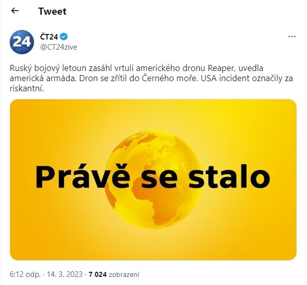 Ruský bojový letoun zasáhl vrtuli amerického dronu Reaper, uvedla americká armáda. Dron se zřítil do Černého moře. USA incident označily za riskantní.