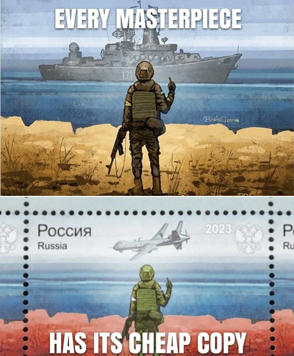 "Každé mistrovské dílo má svou levnou kopii", aneb rusko vydává známku na počest "sestřelení" amerického dronu MQ-9 Reaper. Kvůli absenci jakékoliv kreativity se ale rozhodli zkopírovat mem, který Ukrajinci vytvořili poté, co v létě 2022 potopili ruskou vlajkovou loď Moskva. Kresbu ukrajinského umělce Boryse Hrocha, která zobrazuje ukrajinského vojáka jak posílá Moskvu "na chuj", zcela okopírovali - nahradili loď dronem a pozměnili barevné pozadí. Tady je zkrátka krásně vidět rozdíl mezi kreativní "Majdanovou omladinou" a ruským "gerontistánem".