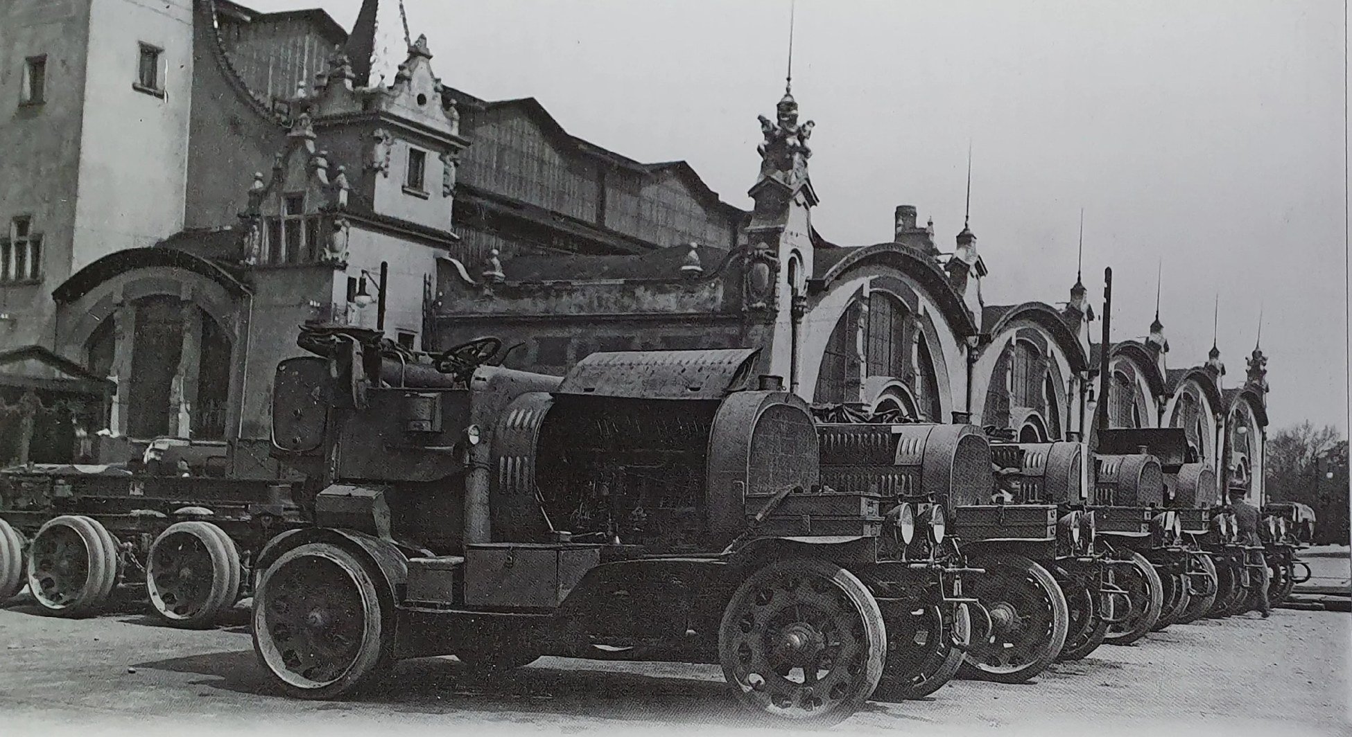 V kolech zadní nápravy tahače Daimler byly vestavěné elektromotory, které umožňovaly jízdu po silnici, v terénu a po železnici.