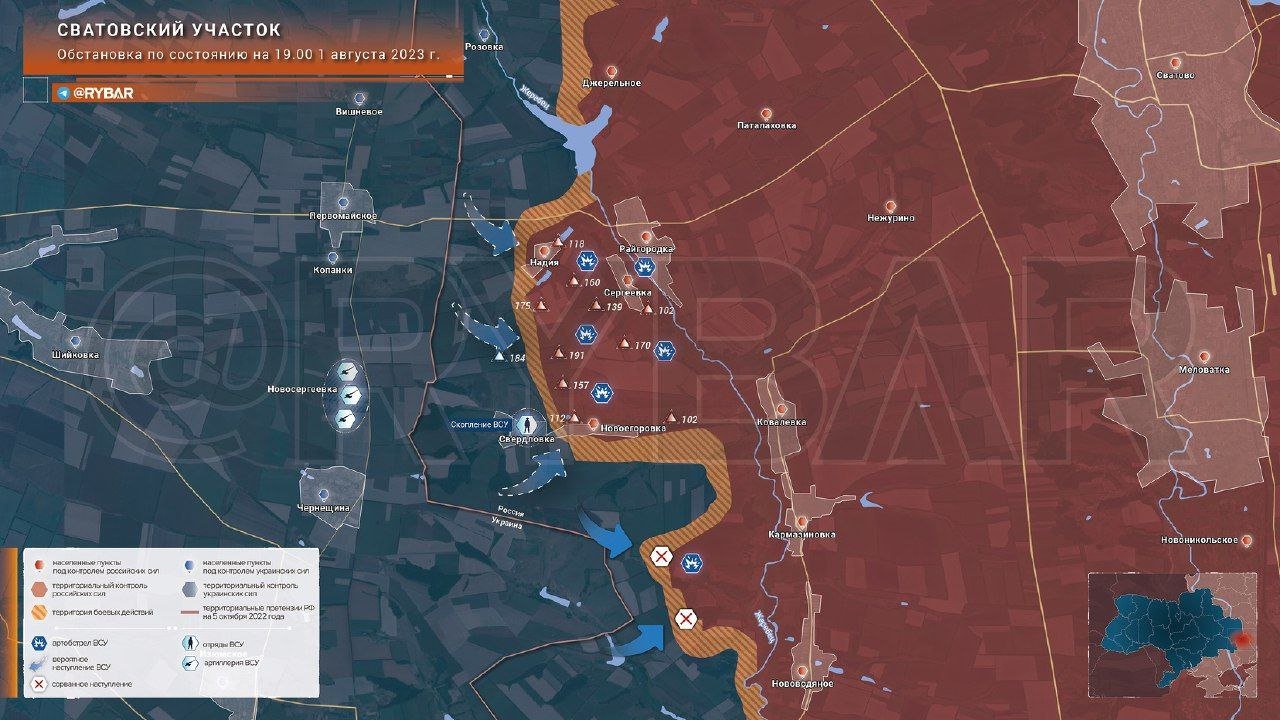 Svatovského úsek: poziční boje u Karmazinovky, situace k 1. srpnu 2023 v 19.00 hod.