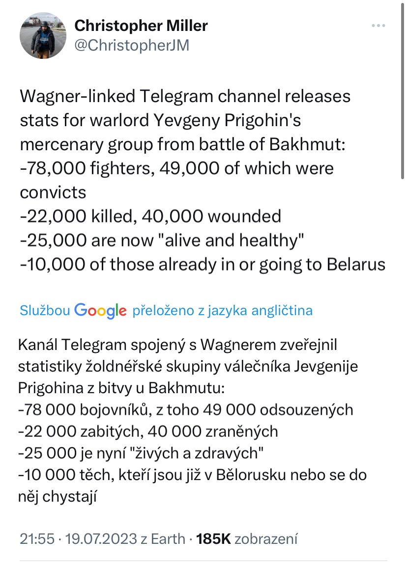 Pátek. Igor „Strelkov“ Girkin pravděpodobně… dogirkinoval. Jeho manželka dnes v poledne informovala na Telegramu, že Igor byl zadržen ruskými úřady na základě obvinění z extrémismu (článek 282 ruského trestního zákoníku). Pokud se dá usuzovat z toho, jak probíhala podobná obvinění v minulosti, hrozí Girkinovi až několik desítek let za mřížemi. Stejné obvinění například vyneslo 7,5 roku pro manažera Navalného kampaně a mnohem delší tresty pro některé politiky, kteří protestovali proti invazi na Ukrajinu. Vzhledem k tomu, jak kritický byl Girkin vůči ruskému režimu v posledním roce, nebylo otázkou, zda bude zadržen, ale spíše – kdy. Igor Girkin je vůbec zvláštní postavičkou. Mezinárodním trestním soudem je hledaný pro terorismus kvůli jeho podílu na sestřelení letu MH-17. V minulosti byl také jako důstojník FSB jedním z hlavních strůjců vojenského převratu na Krymu a rozpoutání války na Donbasu. Nicméně poté, co byl Ruskem odstaven na druhou kolej, poskytoval ve svých úvahách pravidelně velmi střízlivé zhodnocení situace v Rusku i na frontě. Pokud by nebojoval na straně Ruska, ale působil v západních státech, zcela jistě by se takový člověk vypracoval na vysoké pozice v armádě a byl by respektovaným velitelem pro svou inteligenci, zkušenosti a schopnost pojmenovávat rizika dříve, než nastanou. Namísto toho si ale vybral službu postupně se fašizujícímu režimu, a tak vejde do historie pouze jako terorista. A bude zajímavé sledovat, co si pro něj Putinův režim přichystal. A ještě se děje tohle: