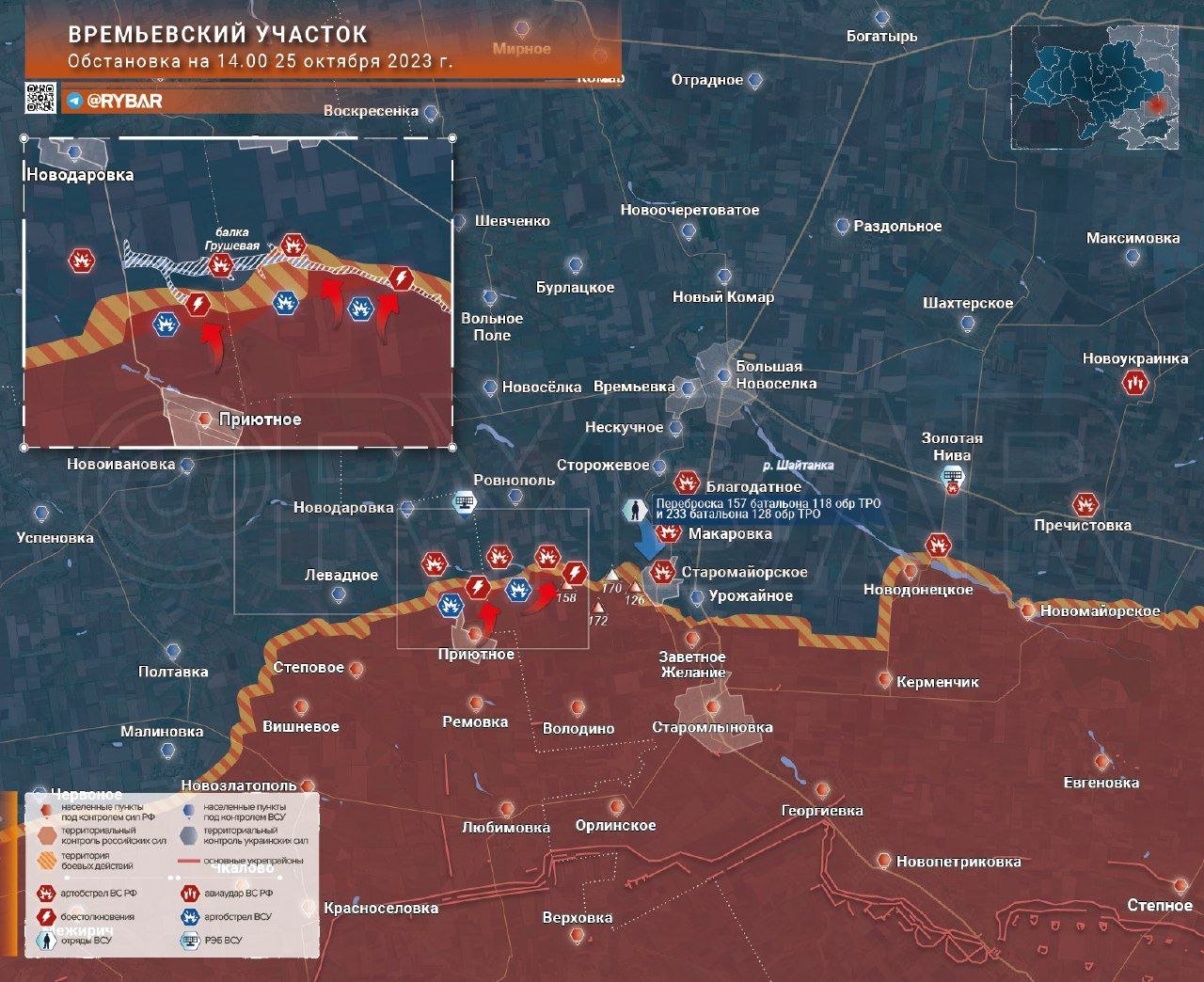 Voin DV (https://t.me/voin_dv) uvádí, že ofenziva přichází ze směru od Prijutného podél lesních pásů na severu u Gruševského žlebu. Bojovníkům ruské armády se podařilo částečně vytlačit nepřítele do rokle, ale boje stále pokračují.
