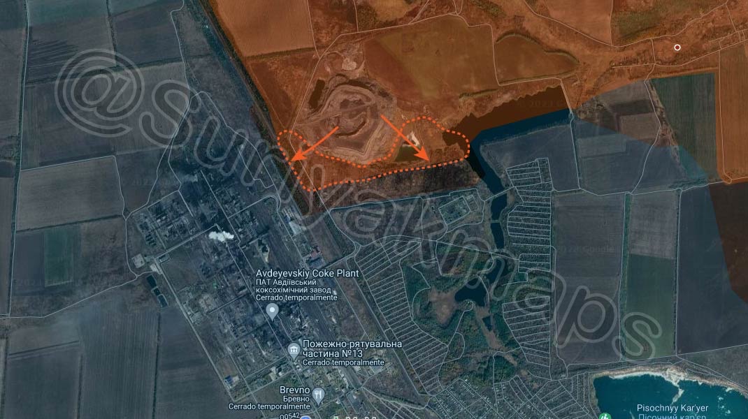 Situace severně od Avdějevky: Ruská armáda rozšířila kontrolu kolem haldy tím, že převzala kontrolu nad přilehlými lomy a částí stromořadí severovýchodně od koksovny. Je velmi pravděpodobné, že se v příštích dnech dočkáme útoku na tuto průmyslovou oblast. Nejen proto, že se nachází ve výšině, ale také proto, že si otevírá cestu k postupu do městské oblasti z této osy vyhýbající se otevřenému poli východně od železnice.