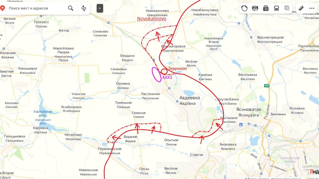 Na rozdíl od některých zpráv na síti dnes nedošlo k žádným útokům ve směru na koksovnu Avdějevka. Směrem našeho útoku byla obec Novokalinovo, k níž se naše jednotky znatelně přiblížily (vzali jsme v úvahu poučení z neúspěšného prvního hodu, zajišťujeme boky a týl postupující skupiny).