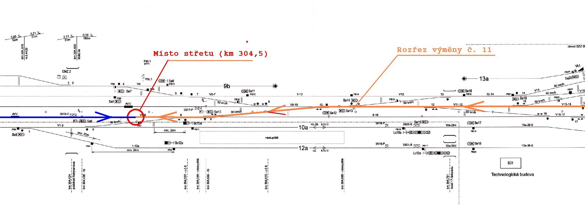 3) Pokračoval po 1SK k výhybce č. 11 tu řízl (jel po jejím hrotu) a dojel k výhybce č. 10 (proti hrotu) a tak se přes výhybku č. 8 (po hrotu) dostal na 2 SK, kde se na km .304,5 strazil s tím 41350.