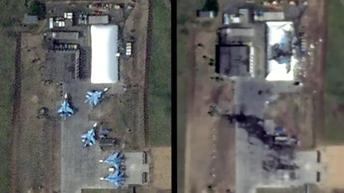 Šéf Hlavního zpravodajského ředitelství ukrajinského ministerstva obrany Kyrylo Budanov prozradil, že ukrajinské síly použily v noci na 14. června nejméně 70 bezpilotních letounů k útoku na ruskou leteckou základnu Morozovsk. Podle Budanova byla operace zahájena z ukrajinského území a letiště zasáhlo nejméně 70, možná i více ukrajinských bezpilotních letounů Dragon a Splash. Šéf HUR dodal, že probíhá vyhodnocování škod: "Čekáme na informace" o tom, zda byla nějaká letadla zničena nebo poškozena. Mezitím snímky z Planet Labs ukazují poškození krytu hangáru umístěného na údržbové ploše, uvnitř jsou vidět dva stíhací bombardéry Su-34. Již dříve zveřejnil analytik OSINT Brady Africk satelitní snímky letiště Morozovsk v ruské Rostovské oblasti před útokem v noci na 14. června a po něm. Šlo o druhý rozsáhlý útok ukrajinského dronu na Morozovsk za poslední dva měsíce. Budanov také uvedl, že základna bude napadena znovu. Konkrétně odpověděl "ano" na otázku, zda ukrajinské síly plánují další letecký útok na letiště. Ruské ministerstvo obrany uvedlo, že v noci na 14. června síly protivzdušné obrany údajně zachytily a zničily 87 ukrajinských dronů nad územím Ruska a dočasně okupovaného Krymu. Ruské kanály Telegram napsaly, že obyvatelé Morozovska v Rostovské oblasti hlásili v noci výbuchy a že ve městě hořelo. Telegramový kanál Astra připomíná, že v Morozovsku se nachází vojenské letiště.