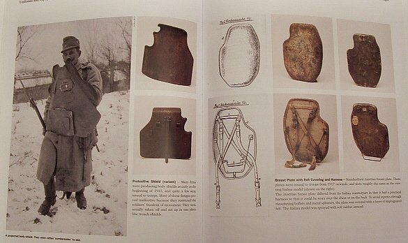 Teda to co má ten rakouský voják je hodně zvláštní a řekněme bizardní. Nejspíš se jedná o nějaký zákopový štít, který bylo možné připevnit na hruď. Tvarem je ale dost divný, sice kraje i ruce, ale krk je úplně nekrytý. Dvě střílny, jeden malý průzor a divná dvířka vespod - asi se odklápěly nahoru + je tam další odklápěcí střílna. Absolutně netuším oč se jedná, snad je to nějaká zakázková výroba. R-U pancéře jsou zkrátka absolutně neprobádaná kapitola -myslel sem že se zde nepoužívaly žádné pancéře, ale zdá se že přeci jen se občas něco používalo.