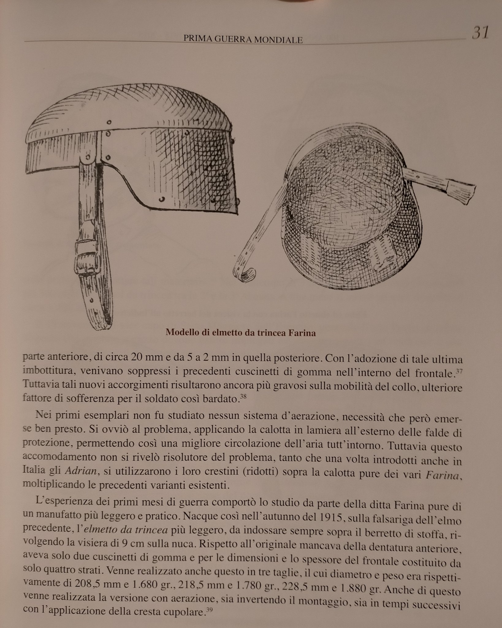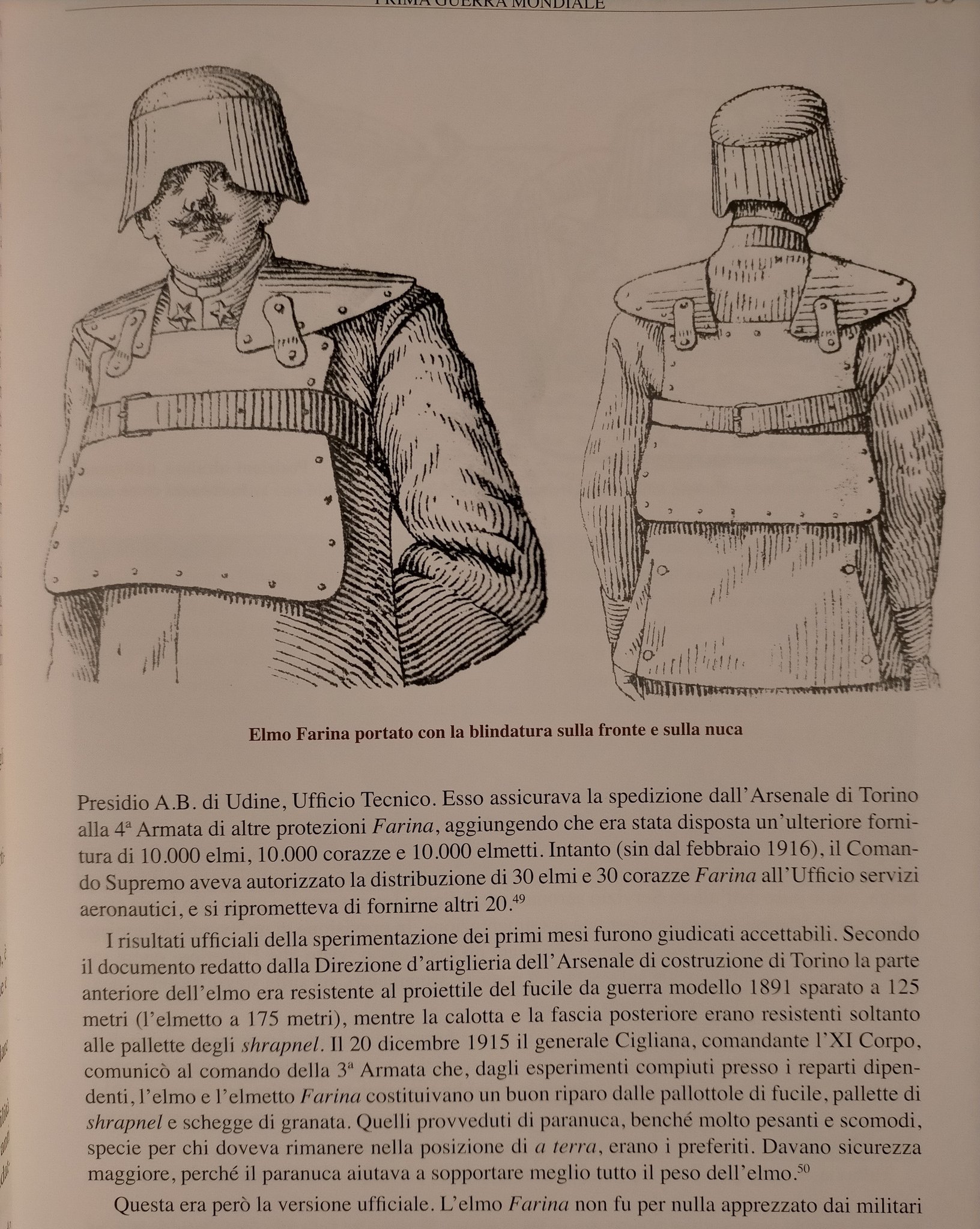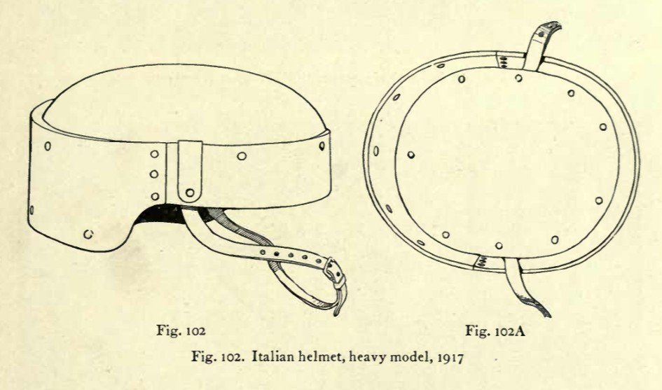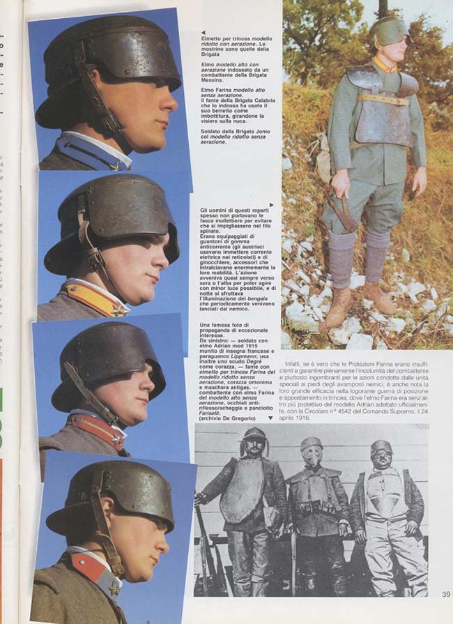 Italský generální štáb se začal zajímat o ochranu pěchoty již krátce po vypuknutí války. Už v roce 1915 se italští vojáci příležitostně vydávali na frontu s improvizovanými, neprůstřelnými pomůckami. Zaznamenány jsou případy, kdy vojáci nosili na hrudi pytle s pískem, improvizované pancéře nebo různé kovové destičky. I když byly tyto ochranné prostředky velice primitivní, zachraňovaly vojákům v poli životy a používaly se prakticky po celou dobu války. První přilby, které používala italská armáda, byly francouzské přilby typ Adrian. Tyto přilby sice byly velkým pokrokem oproti prostým čepicím, které se používaly doposud, polní podmínky si ale vyžadovaly silnější ochranu hlavy. Zvláště pak kvůli nebezpečí poranění hlavy, které hrozilo při boji ve vysokých horách. Z chrom-niklové oceli tak byly vyráběny různé druhy těžkých přileb italské výroby (Farina). Váha těchto přileb činila 4 libry. Široký lem přilby byl vytvořen ze tří samostatných plátů litiny, které byly spojeny pomocí nýtů. Ač se tento typ přilby zdá být velice odolný, poválečné testy prokázaly, že její balistická ochrana je nedostačující. Dalším typ italských přileb měl prostý puklicový tvar a jen velmi omezeně chránil nositelovu hlavu. Tento typ byl mnohem lehčí než první popsaná varianta přilby, ale díky větší tloušťce materiálu, poskytoval lepší ochranu než přilba Adrian. Bohužel se mi nepodařilo vypátrat nic bližšího. Nejpodobnější této přilbě byla francouzská puklice nebo německá Gaedeho přilba, jen bez nánosníku. Cílem tedy nejspíše bylo poskytnout vojákům ochranu před padajícím kamení.