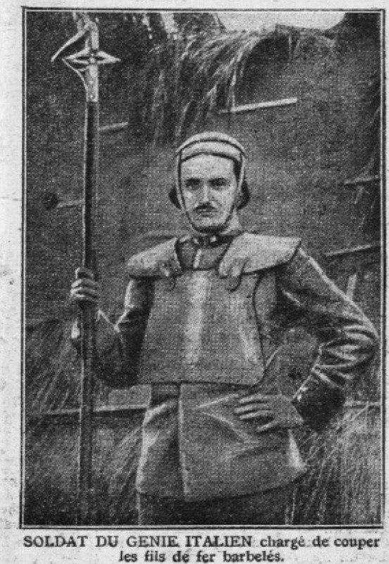 Jedním z nejznámějších pancéřů, které se používaly za první světové války, je jednoznačně italská zbroj známá pod názvem Farina, podle továrny, v niž byla vyráběna. Tyto zbroje se vyráběly v jedné velikosti, hrudní díl měl lichoběžníkový tvar o rozměrech 30x40 cm. Tento díl byl složen z pěti vrstev chrom-niklového plechu. Tyto díly byly spojeny třiadvaceti nýty a tloušťka celého kyrysu činila 6 mm. Zbroj také zahrnovala chrániče ramen, které byly složeny ze čtyř vrstev ocelového plechu. Chrániče ramen byly připevněny jen volně pomocí popruhů s posuvnou sponou. Chrániče ramen bylo možno snadno odepnout a hrudní plát použít opět jako štít. Stejná výrobna (Farina), produkovala též lehcí, segmentovou zbroj, která byla složena z několika spojených plátů. Tato zbroj umožnovala mnohem větší ohebnost než základní typ. Tuto zbroj také bylo možno nosit pod uniformou a společnost ji nabízela k volnému prodeji. Vojáci si ji tedy museli v případě zájmu opatřit z vlastních prostředků. Dalším typem zbroje byl kyrys zvaný Orfei, víc se mi ale nepodařilo vypátrat. Na základě licence Ansaldo byla vyráběna zbroj zvaná Daigre. Existovaly též další varianty zbrojí a pancéřů, leč ty byly vyráběny na zakázku, dle individuálních požadavků jednotlivých důstojníků. Zbroj Farina také měla obdobným způsobem řešenou přilbu. Na začátku článku jsem ji již zmínil. Tyto přilby měly různé tvary a různé varianty se od sebe lišily. Spočným znakem byl ale prostý válcovitý tvar se silným lemem, který byl opatřen vykrojením. Základní zbroje typ Farina se dostávaly na frontu v různých kombinacích, často s přilbami Adrian atd. Také je vhodné zmínit, že tyto zbroje byly určeny ke zcela odlišným účelům, než tomu bylo u ostatních států. Tyto zbroje totiž byly určeny k ofensivním akcím. Těmito pancéři byly vybaveny italská přepadová družstva zvaná Compagnie della morte (jednotky smrti). Primární úlohou těchto jednotek bylo dostat se až k nepřátelským pozicím, zničit protipěchotní překážky a přestříhat ostnatý drát. Nemusím připomínat že se jednalo o velice nebezpečnou práci. Zbroje totiž nedokázaly odolávat soustředěné palbě z kulometů a často je dokázaly prostřelit i pušky Mauser nebo Mannlicher. O nekrytých místech ani nemluvě. Zbroje Farina se dostaly i do výzbroje belgické armády, což je nejspíše zapříčiněné příbuzenskými vztahy mezi královskými rody obou států. Dostaly se sem patrně ve větším množství, jelikož existuje několik fotografií se skupinami belgických pěšáků v kompletní zbroji Farina.